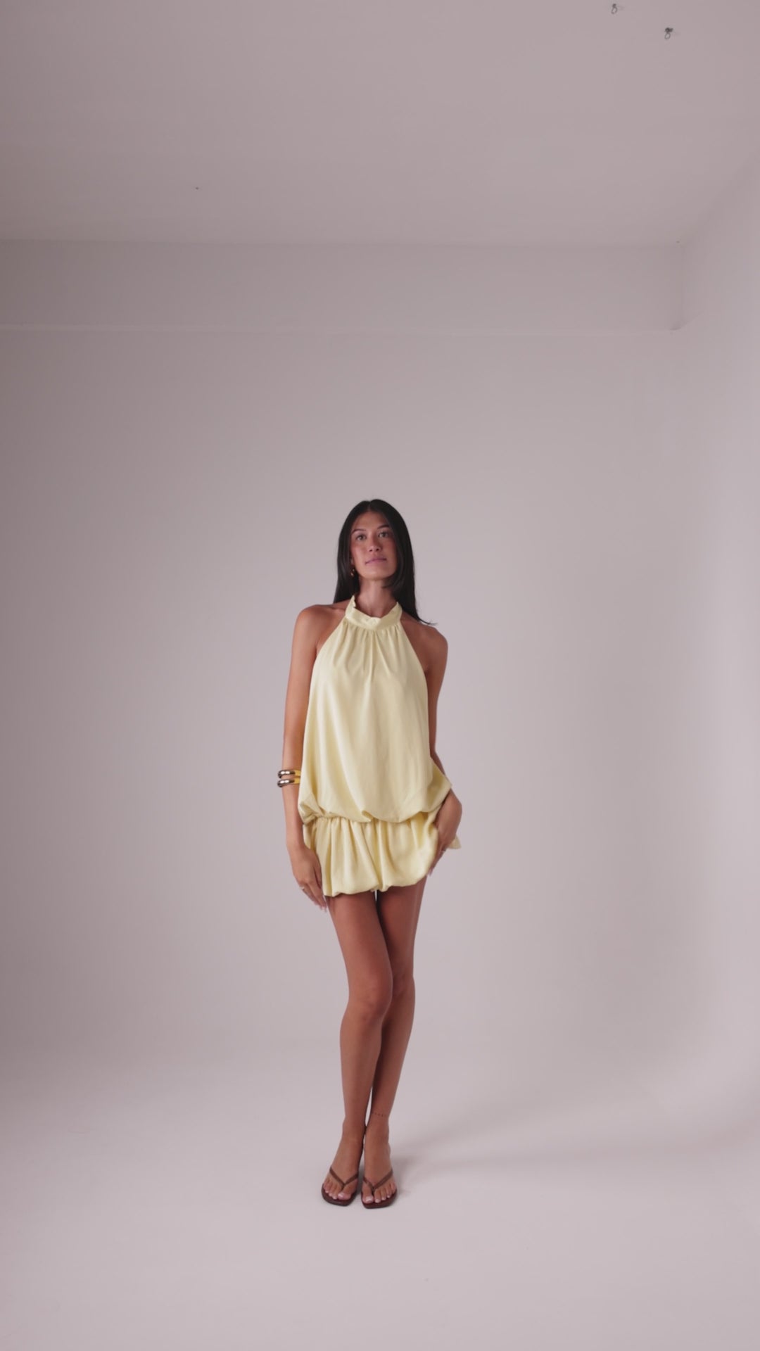 Backless balloon-style dress with a halter neck tie for a refined and feminine silhouette.